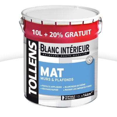 Peinture murs et plafonds TOLLENS blanc intérieur mat 10L + 20% | Castorama
